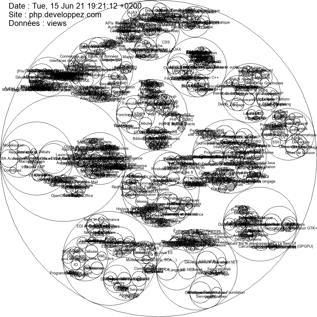 Un site de forums contient des forums qui contiennent à leur tour des forums, chacun d'eux servant de conteneur aux discussions entre les utilisateurs. On désire représenter graphiquement un tel site par des cercles imbriqués, à la manière d'une carte démographique. Les critères de représentation peuvent être par exemple le taux de fréquentation, l'activité en nombre de messages ou de discussions, etc.