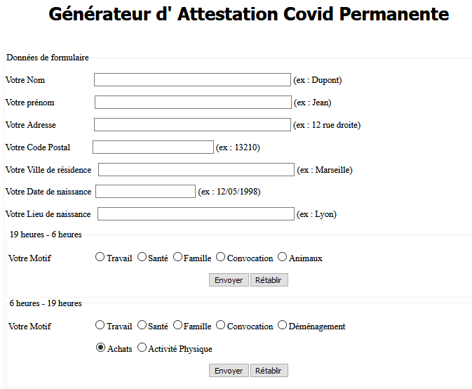 Alors je viens d’écrire en PHP un générateur d’attestation permanente qui se génère avec une date de création de 20 mn avant et une date de sortie de ¼ avant (pour faire plus vrai )!