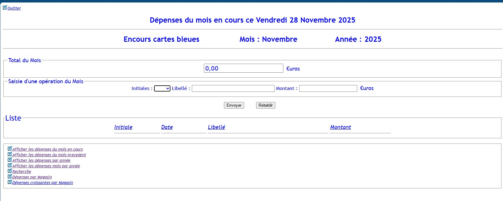 Un petit script (PHP 5.x et MySQLi) qui date pusique j'ai des stats qui remonte à 2016 ! qui permet de gérer le montant de l'encours carte bleu (surtout quand il y en a plusieurs) et de savoir le montant qui va être prélevé le 28 ou le 30 du mois.